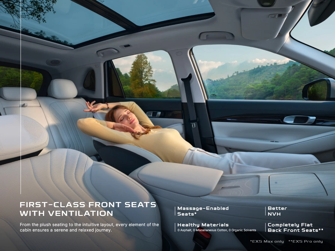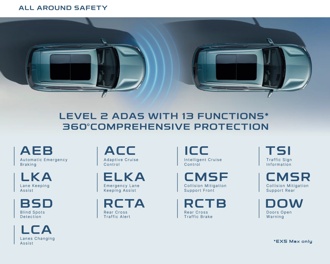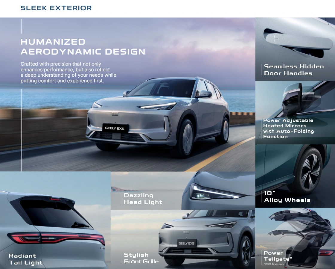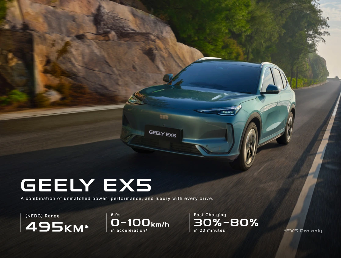 Geely EX5 adalah SUV listrik murni berstandar global yang menawarkan pengalaman berkendara yang cerdas dan aman, didukung oleh Baterai Short Blade generasi terbaru yang unggul dalam keamanan (tanpa asap, api, ledakan), daya tahan, dan pengisian cepat (30-80% dalam 20 menit). Kendaraan ini menampilkan struktur bodi Cell-to-Body (CTB) terintegrasi untuk kekakuan dan stabilitas optimal, serta ruang kabin terluas di kelasnya. Ditenagai sistem penggerak listrik cerdas 11-in-1 dengan akselerasi 0-100 km/jam dalam 6,9 detik untuk varian PRO, EX5 juga dilengkapi fitur ADAS cerdas L2 dan dirancang dengan standar keselamatan bintang lima.
